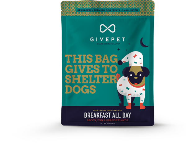 GivePet Breakfast All Day Grain Free Dog Treats are healthy bites made for your favorite pooch. Each oven-baked treat is made for a tasty breakfast combo your dog will love. GivePet donates the same goodness to shelters for every bag sold.