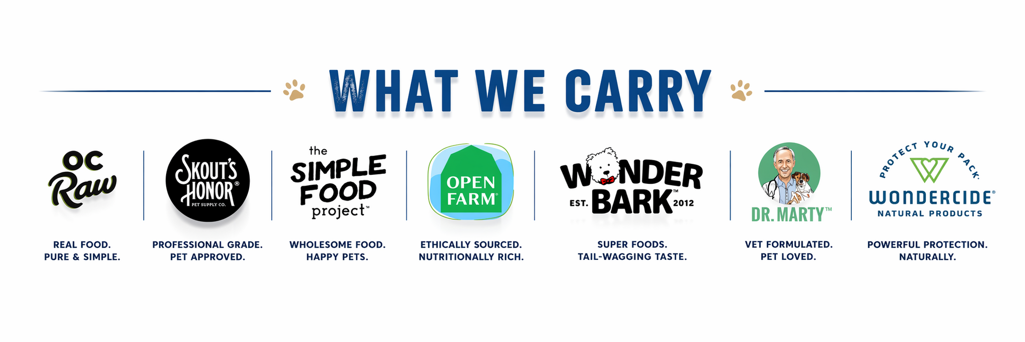 You’ll find favorites like OC Raw, Skout’s Honor, The Simple Food Project, Open Farm, Wonder Bark, Dr. Marty, Wondercide, and more—each one aligned with our mission to support healthier, happier pets.